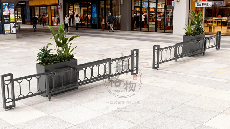 这款带轮花箱护栏采用一体化花箱 + 护栏 + 滚轮的组合设计,整体风格简约大气,适配现代商业与市政场景: